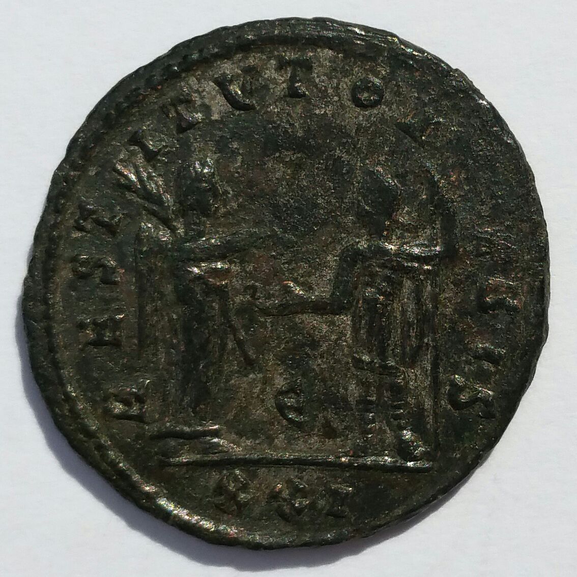 Keerzijde: Aurelian on right, holding scepter in left, standing left, extending right to victory on left who crowns him, xxi in ex